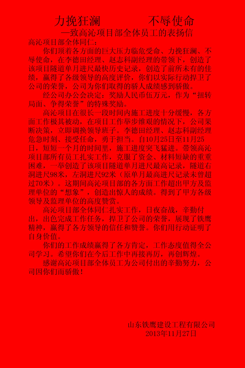 力挽狂瀾 不辱使命—致高沁項目部全體員工的表揚信