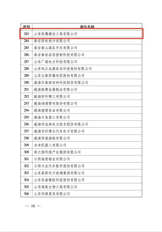 山東省工業和信息化廳公布了2020年度山東省瞪羚、獨角獸企業名單,山東鐵鷹建設工程有限公司成功入選2020年山東省瞪羚企業。